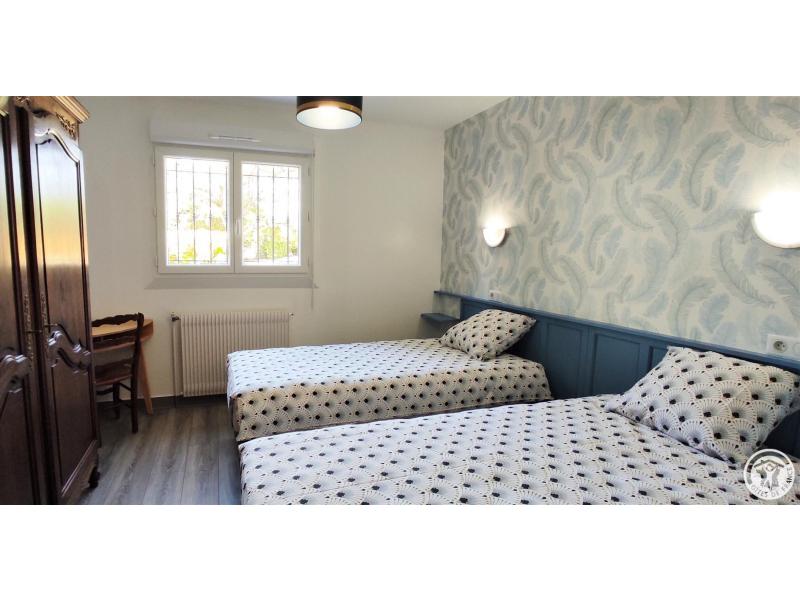 "Les 2 Coqs" est un gite indépendant de 130 m² aménagé sur 2 niveaux pour 6 personnes. Le gite dispose d'un sous-sol réservé aux propriétaires , il est accessible après avoir gravi quelques marches extérieures. Rez-de-chaussée : Entrée; cuisine équipée de lave-vaisselle, micro-ondes, arrière cuisine avec lave-linge; salon-séjour avec TV (102 cm). Une chambre avec 2 lits 90x200 pouvant être rapprochés, bureau. WC. Salle d'eau (douche à l'italienne 1,70 x75cm). A l'étage : 2 chambres avec 2 lits 90x190 chacune - Salle d'eau avec douche ( 1,35x75cm) - Wc indépendant et pièce d'eau avec lavabo. Jardin privatif clos de 800 m² environ avec terrasse ( salon de jardin, chaises longues et barbecue). Stationnement privatif dans la cour fermée (3 voitures). Internet (Wifi - Fibre). Chaise haute et lit de bébé à disposition. Tout est compris dans le prix de la location (draps, linge de toilette (1 serviette et un drap / pers), linge de maison, chauffage, ménage fin de séjour).