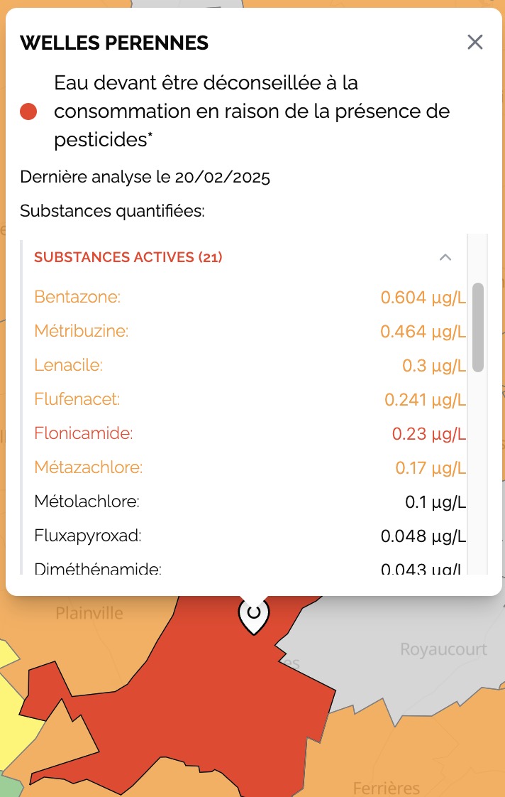Ici, le perchlorate est détecté. Il n'existe pas de norme indiquant un seuil de tolérance admissible pour ce composant. Cependant, l'ARS considère ici que l'eau ne doit pas être consommée par une partie de la population. C'est en partie ce qui explique que la commune apparaît en rouge sur la carte.